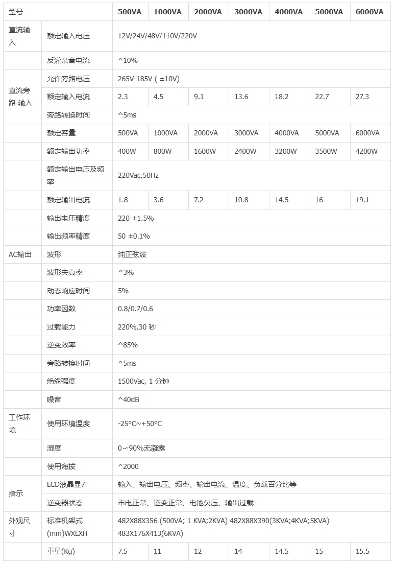 7. 在出现电池电压高/低、过致告警关断输出后, 电池电压恢复正常,电源自动恢复输,消除了过载现象50秒后,电 源自动恢复输出,此项功能尤其适用于无人值守的通讯基站;
